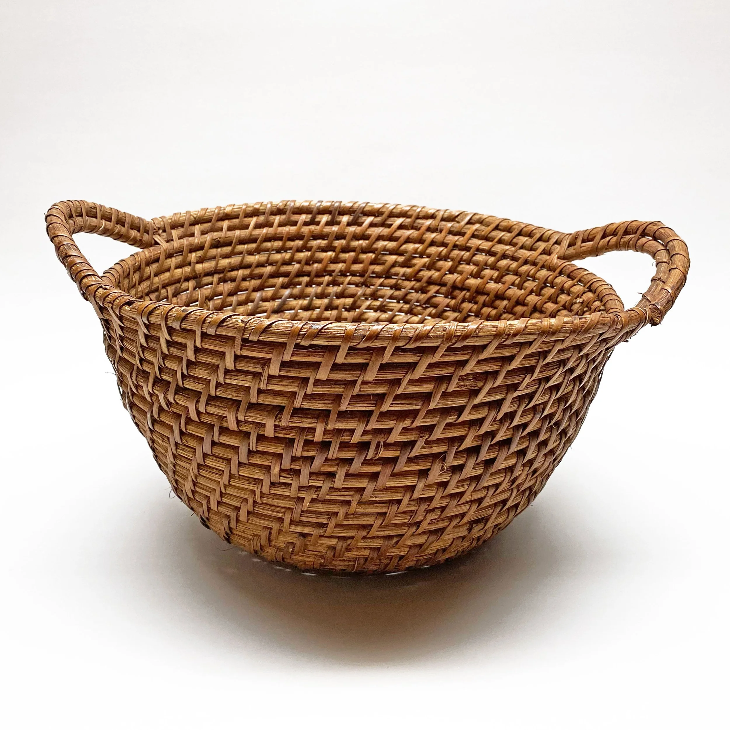 Double-handled woven storage basket, 6.5 inches tall. ‘Made in Philippines’ sticker inside. $16 + shipping. Status: Available for sale