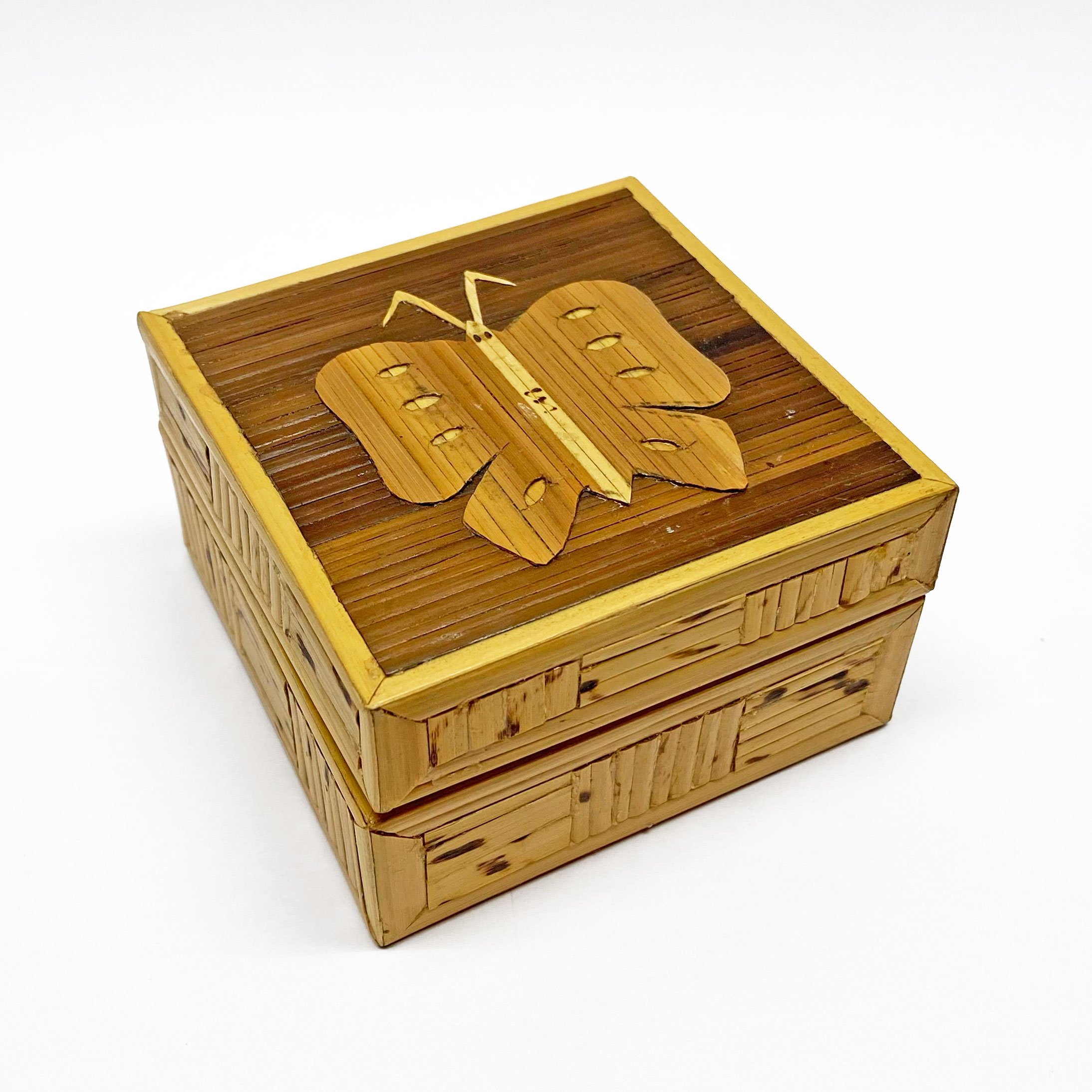Small butterfly wooden trinket box, 3.5 x 3.5 x 2 in. ‘Made in Philippines’ label on the bottom. $8 + shipping. Status: Available for sale