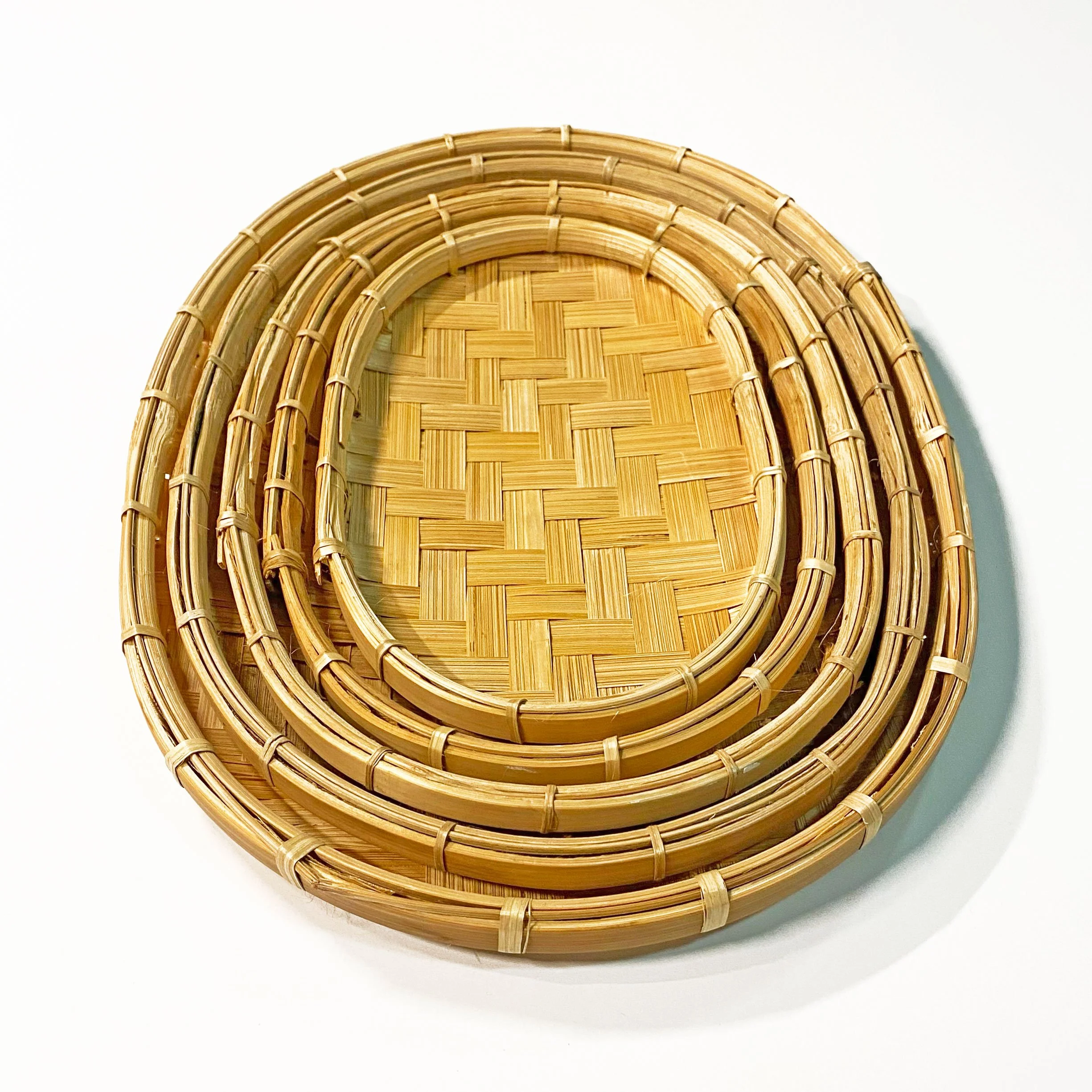Set of 5 oval nesting bilao, largest 12 inches in diameter. ‘Made in Philippines’ sticker on the bottom. $12 + shipping. Status: Available for sale