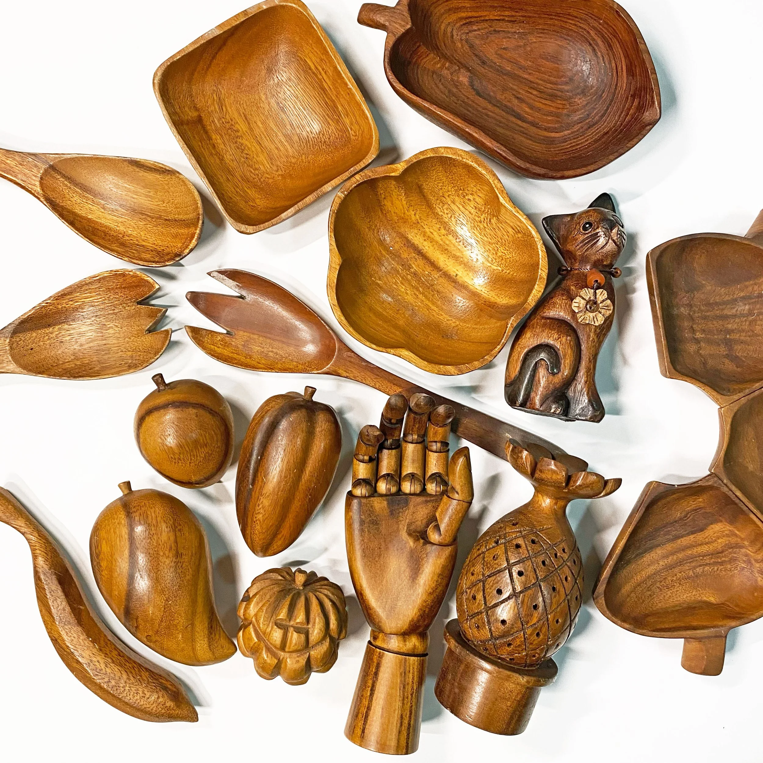 Carved kamatsile fruit, serving utensils, and other wooden objects. Mid-20th century/‘60s era. Found throughout 2025.